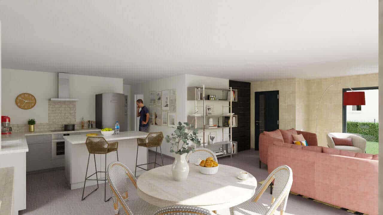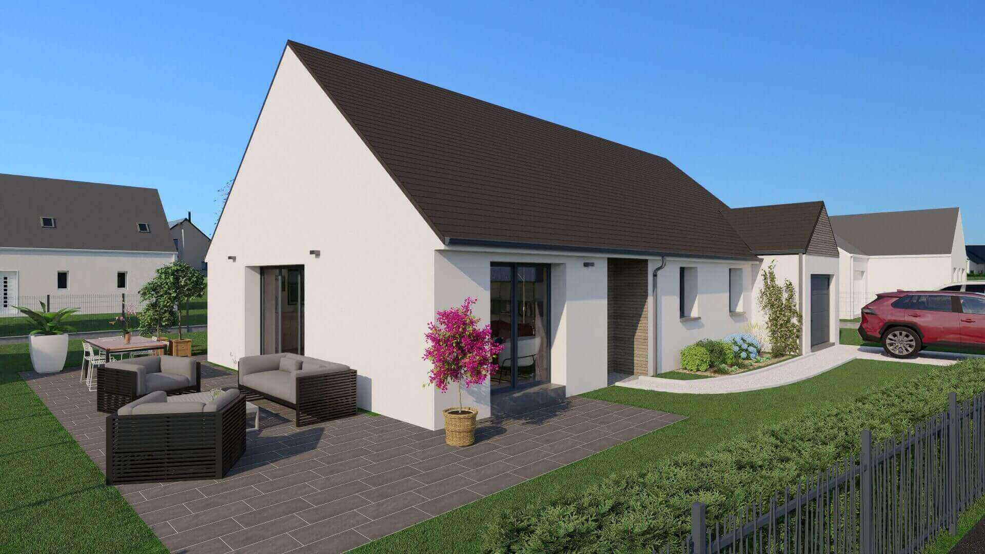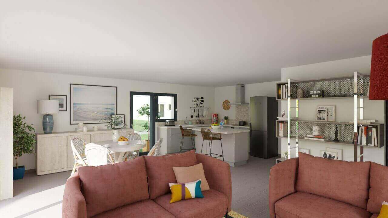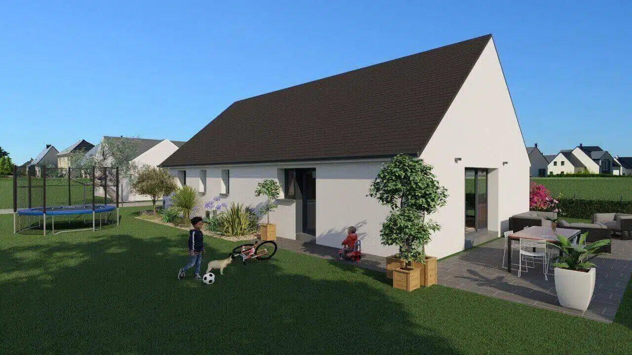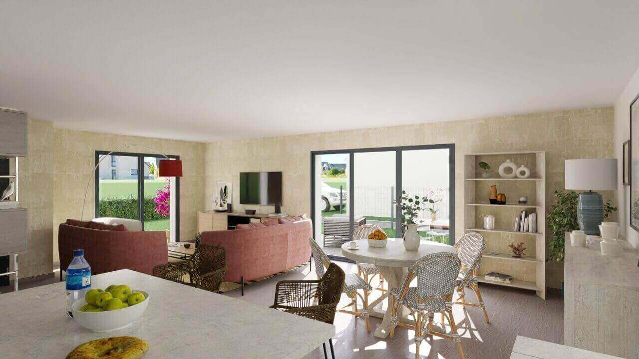 Villa bioclimatique de plain-pied, en campagne proche de la ville. La maison comprend une agréable pièce de vie avec cuisine ouverte sur le séjour, trois chambres avec placard, salle d'eau, WC indépendant, garage et cellier. Confortable, lumineuse et éco-responsable, la maison dispose d'une pompe à chaleur haute performance énergétique et d'un plancher chauffant basse température, volets roulants motorisés avec domotique, menuiseries ALU couleur. Cuve de rétention eaux pluviales.Edifiée sur terrain de 596 m² environ proche de Guérande.Terrain sélectionné auprès de notre partenaire foncier, sous réserve de disponibilité. Prix hors frais d'acte notarié.Contrat de construction CCMI avec assurance Dommages Ouvrages inclus.