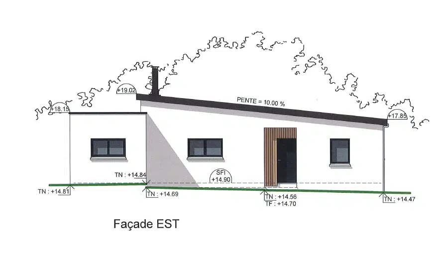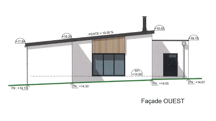 La maison de plain-pied de style contemporain est construite avec des matériaux traditionnels : enduits gratté de ton blanc sur façades, avec du bardage bois naturel, une couverture mono-pente en bac acier laqué de ton gris graphite avec une pente à 10%. Les menuiseries seront en PVC et aluminium de ton gris soutenu.